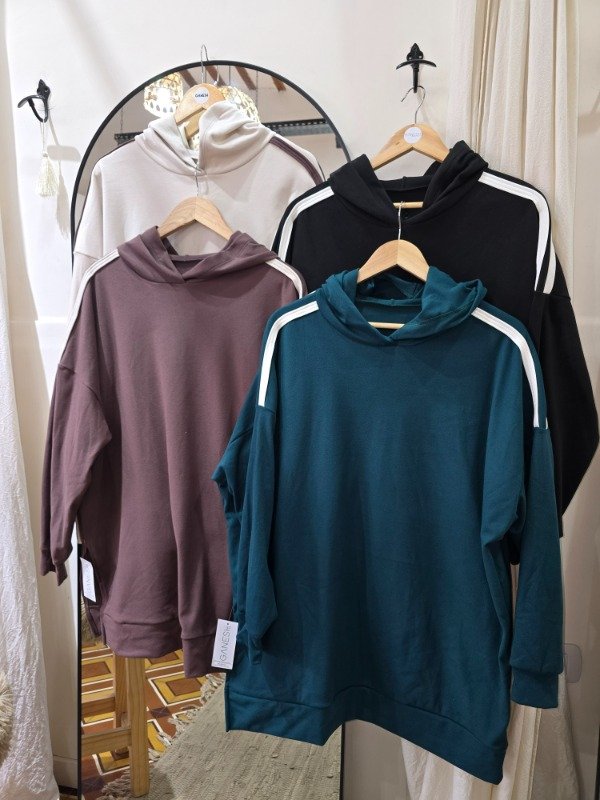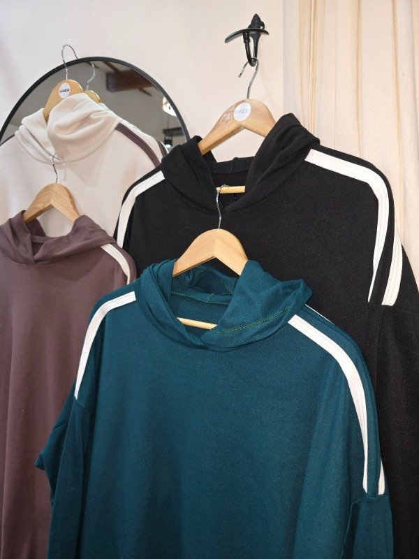 Buzo tela darlon con tiras en hombro frizado. Detalle de capucha y tajo parte derecha.