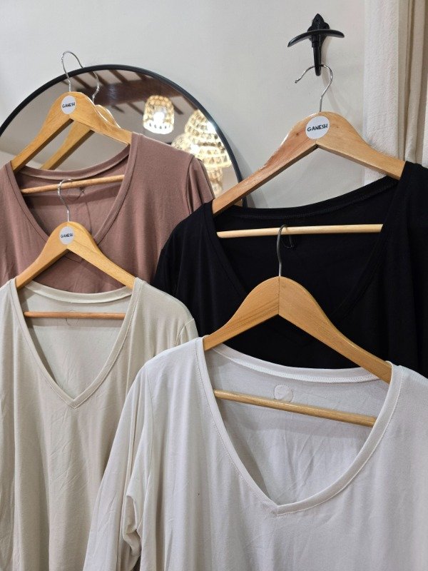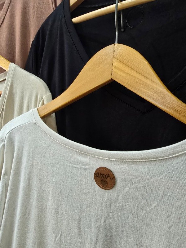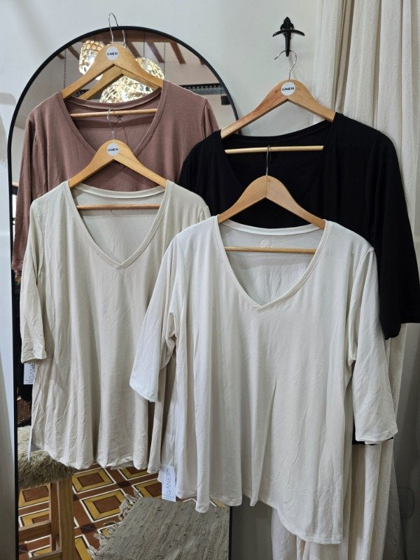 Remera manga 3/4 corte evase tela modal, bien suelta y comoda, escote v, detalle de cuero en la espalda.