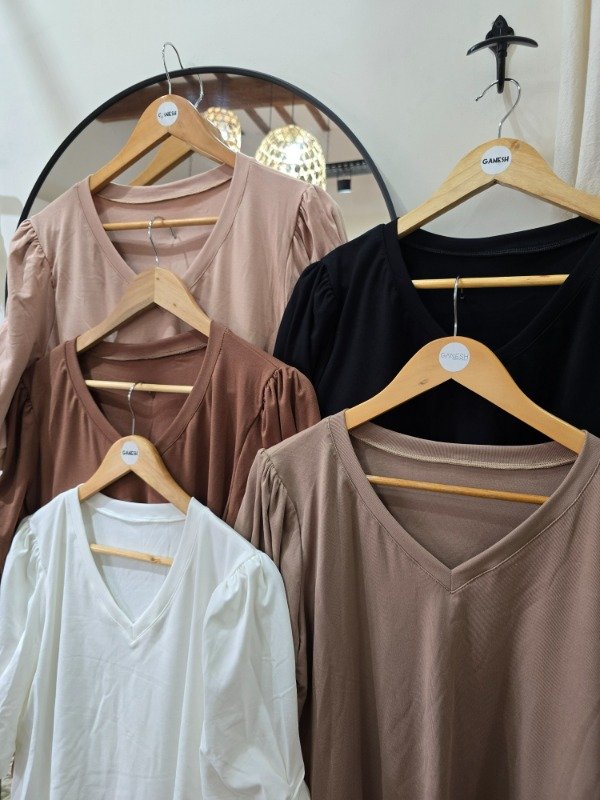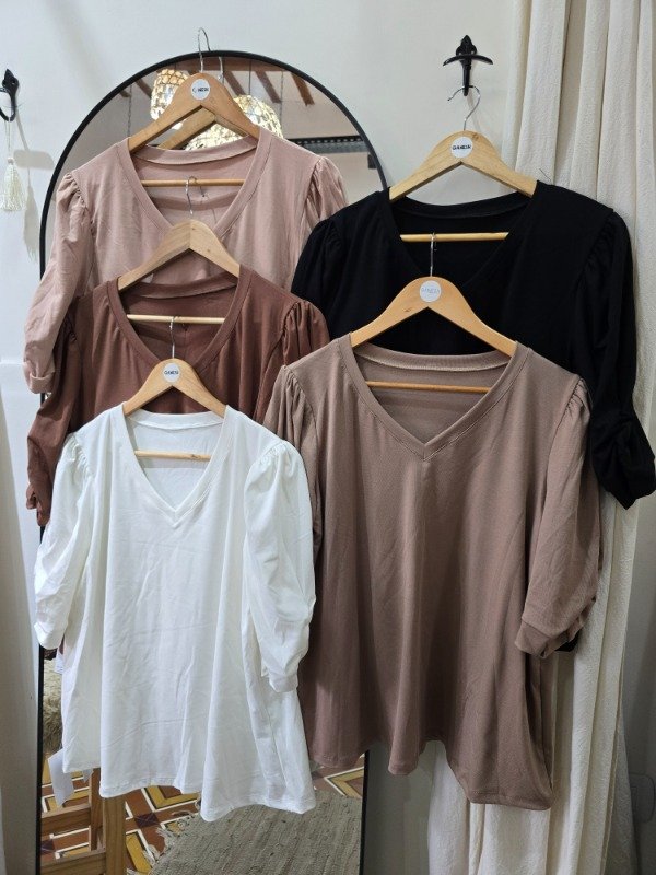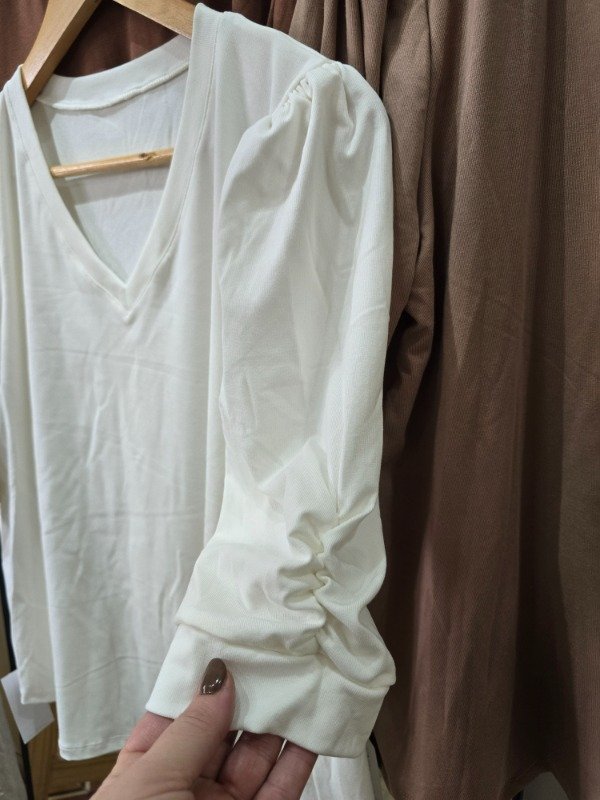Remera escote v, manga princesa con frunce, corte evase.