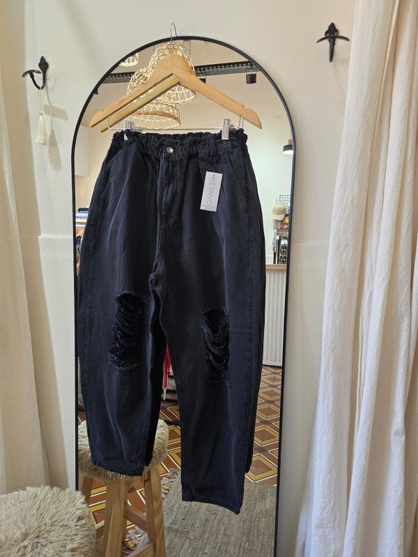 Jean baggi con roturas en las rodillas y elástico en la cintura.