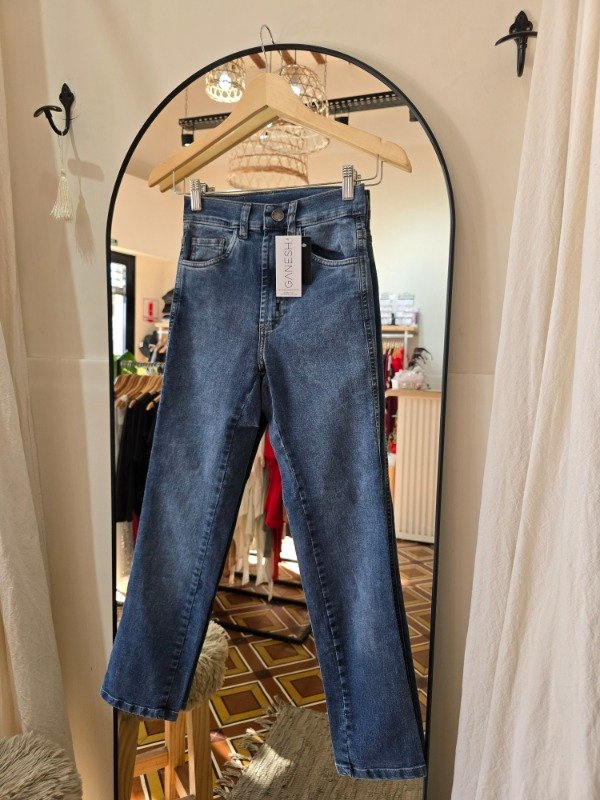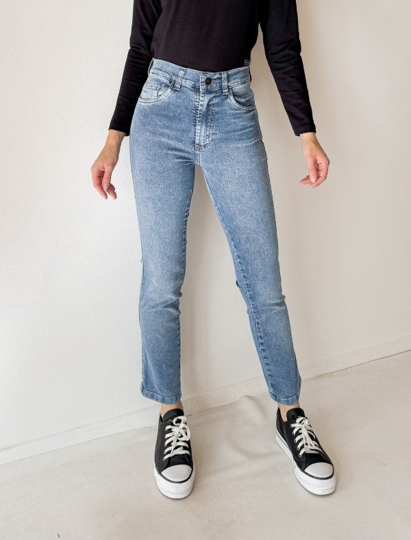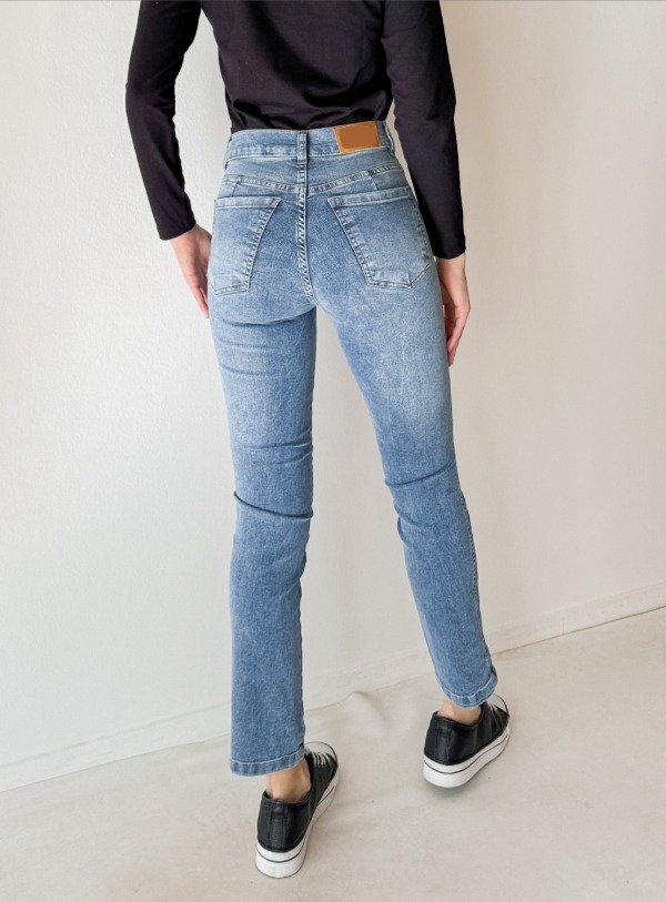Jean recto elastizado celeste gastado. Talles del 34 al 42.
