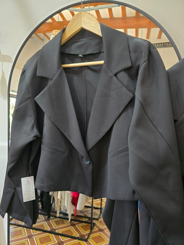 Blazer sastrero liso corto, con hombreras, detalle de tajo en mangas.