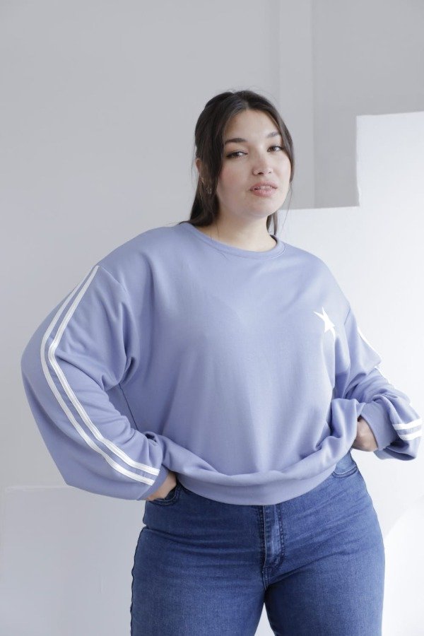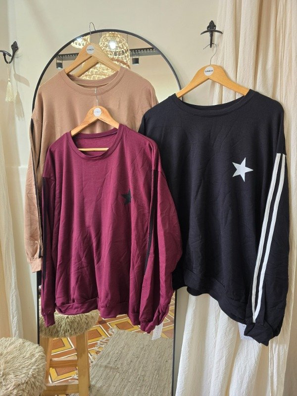 Buzo algodón rústico frizado, detalle de rayas en los brazos y estampa de estrella. Abarca hasta un talle 6.