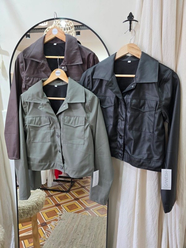 Campera de ecocuero disponible en color negro, verde y chocolate.