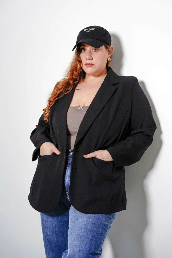 Blazer sastrero con hombreras y bolsillos. Entallado talles grandes.
