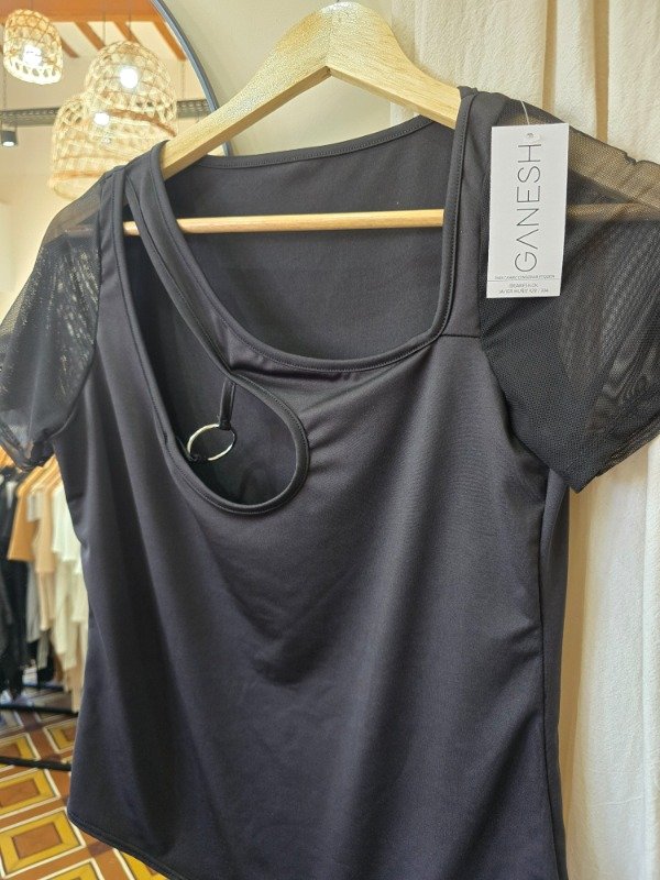 Body de lycra con mangas y espalda tul, detalle de argolla plata en parte delantera. Disponible en varios talles grandes.