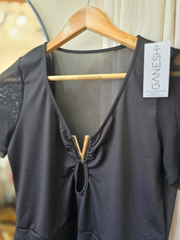 Body de lycra con mangas tul y detalle en escote v color dorado. Disponible en varios talles grandes.