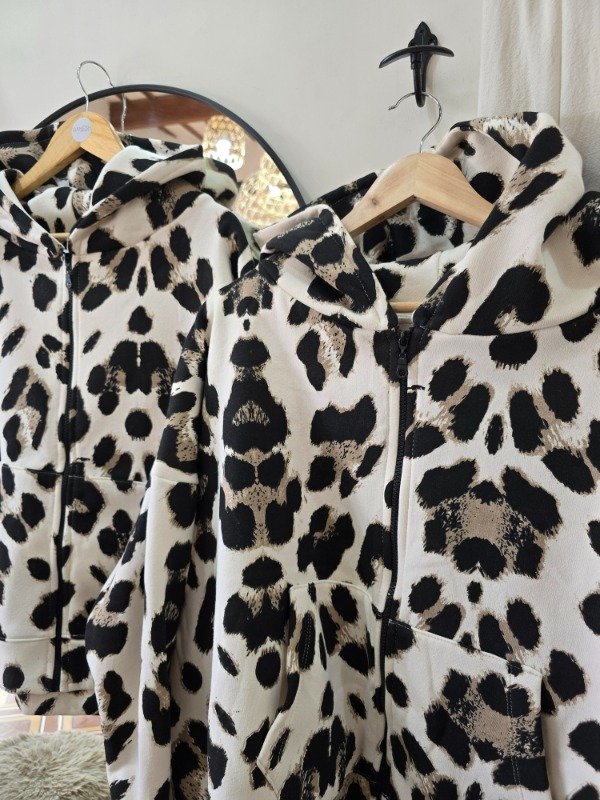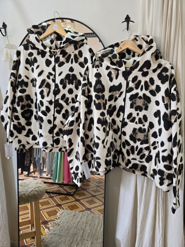 Campera de algodon frizado estampado, con capucha y bolsillos. Oversize.