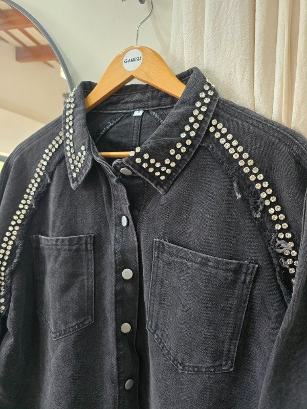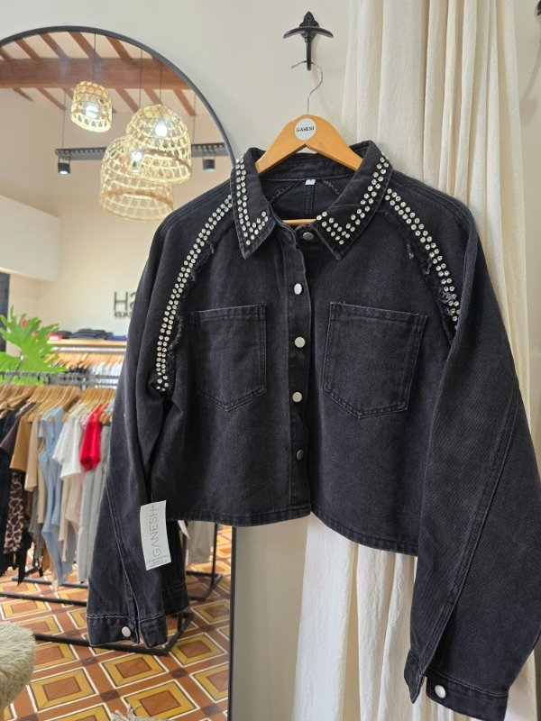 Chaqueta importada de jean color negro gastado oversize. Detalle parte delantera de strass.