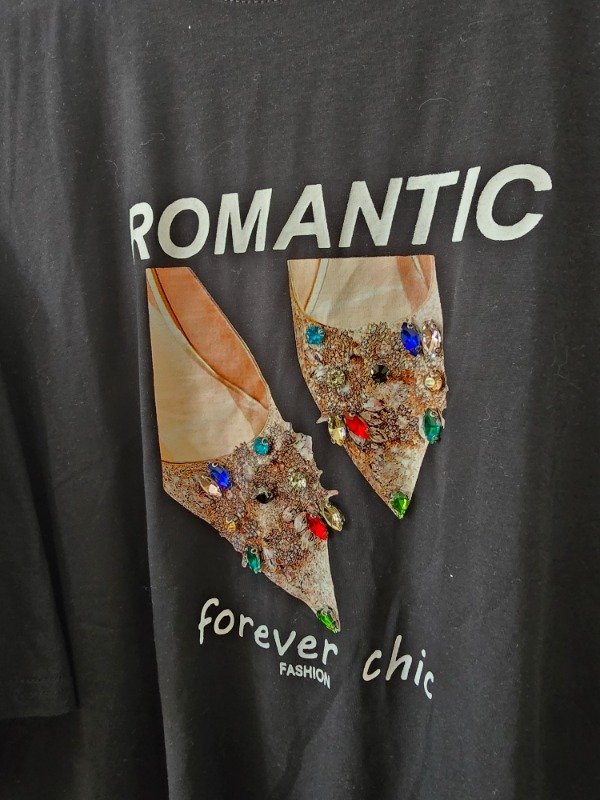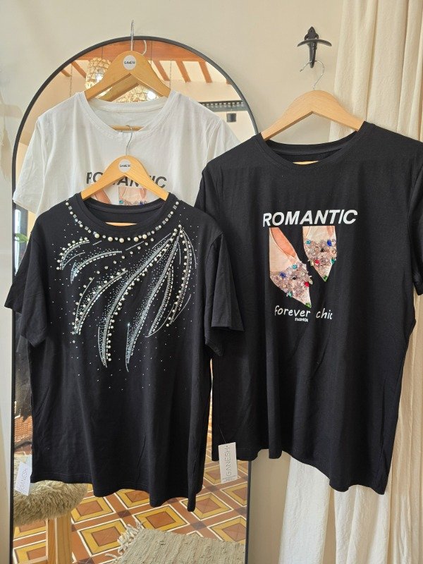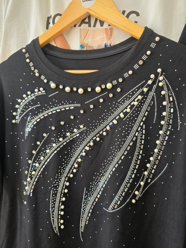 Remera mangas cortas importada, con detalle de strass y apliques de piedras.