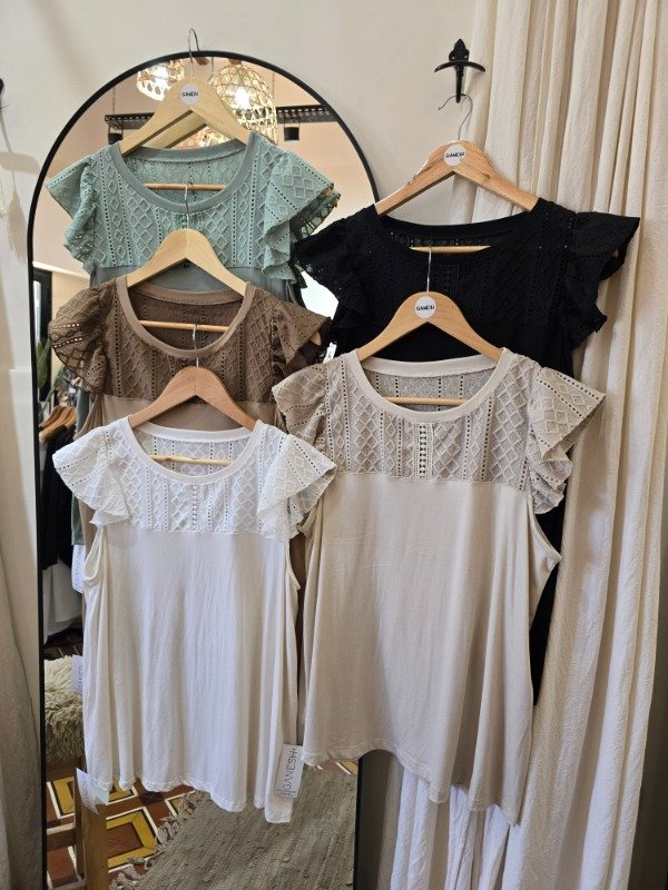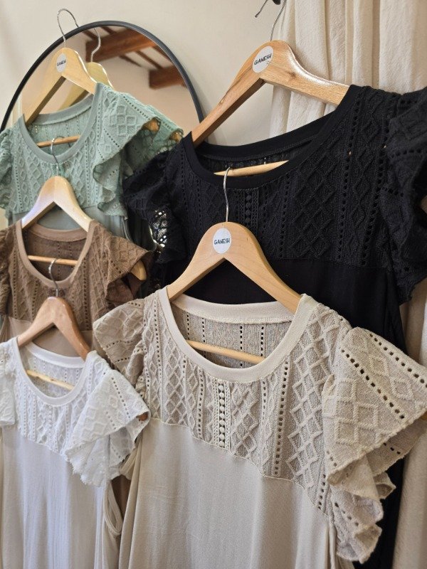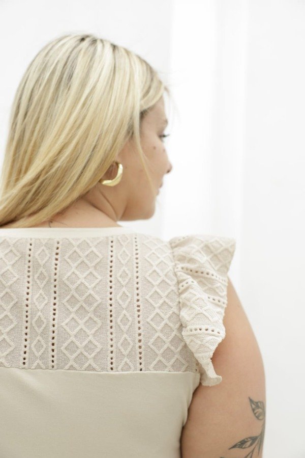 Remera de modal con detalle de broderie en parte superior, con bolados en mangas.