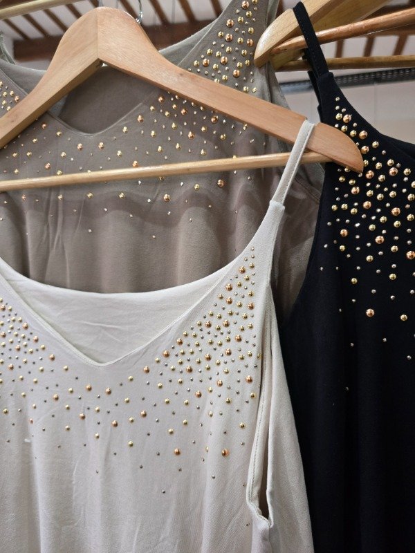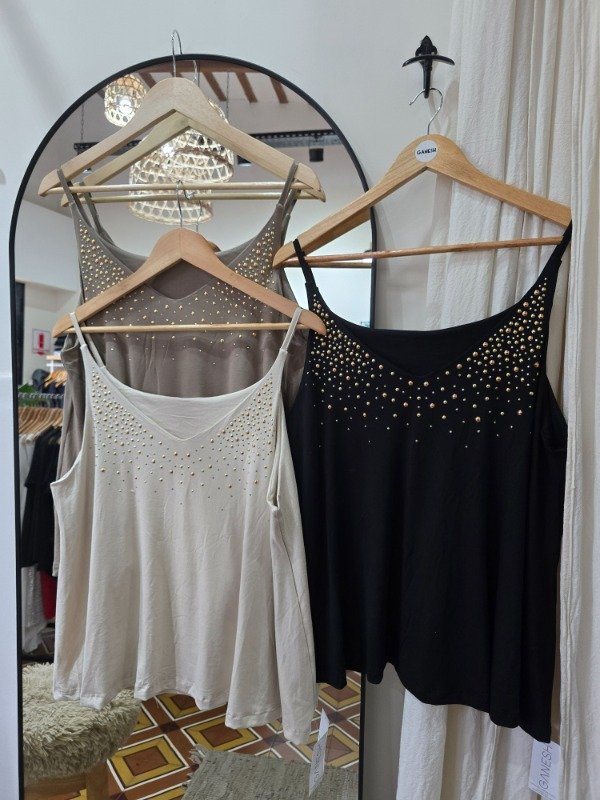 Musculosa de tiras, corte evase bien sueltita, cuello en v con detalle de tachas combinadas en plata y dorado. Abarca hasta un talle 6 aproximadamente.