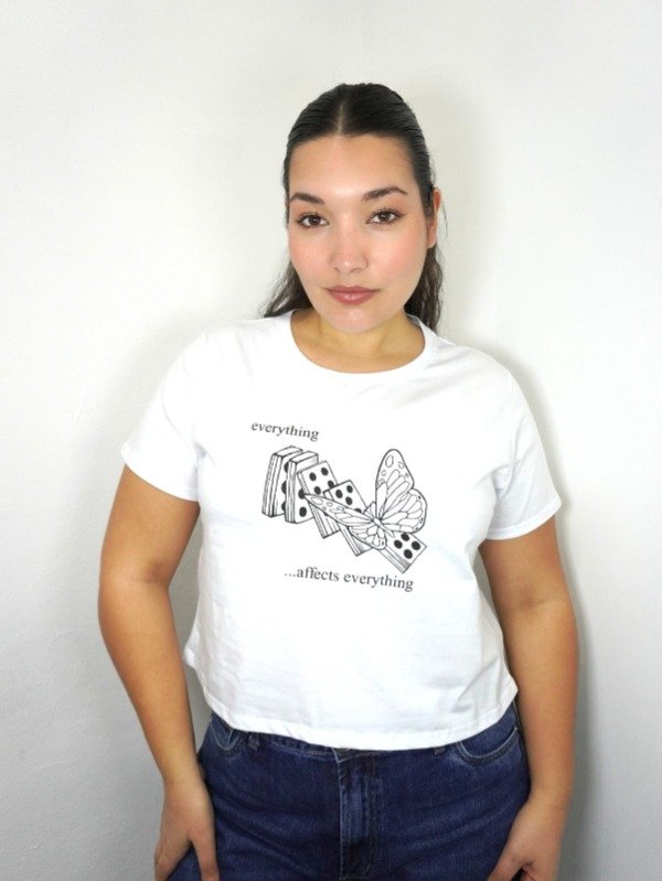 Remera crop top de algodón con estampa, talle unico, abarca hasta un talle XXL aproximadamente.