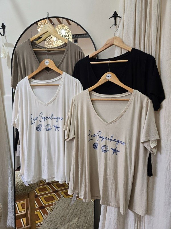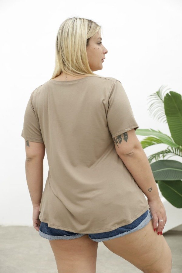 Remera de modal cuello en v, corte evase. Estampada. Talle unico abarca hasta un talle 7 aproximadamente.