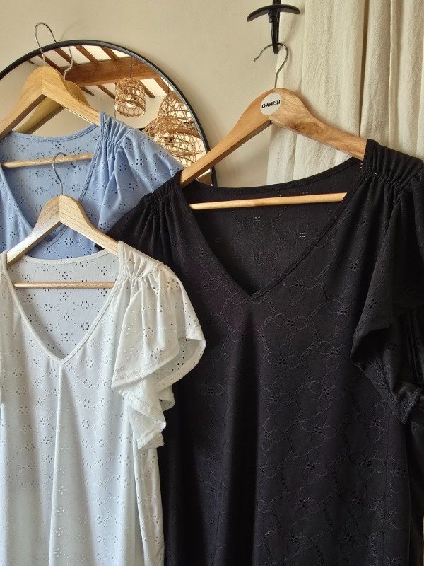 Remera de broderie con detalle en los hombros. Talle unico abarca hasta un 6 aproximadamente.