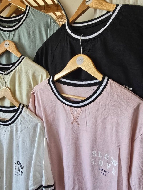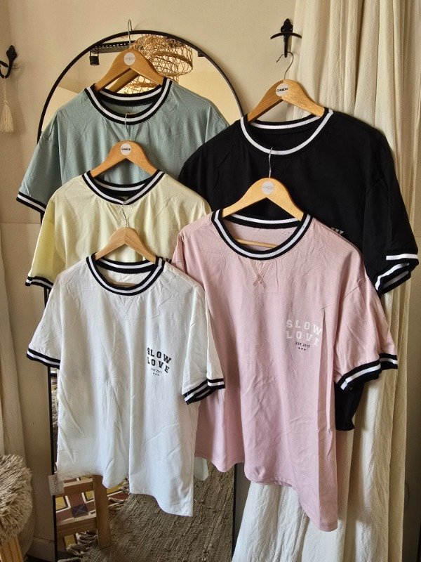 Remera de algodon, detalle en cuello y mangas rayadas, estampa parte delantera.