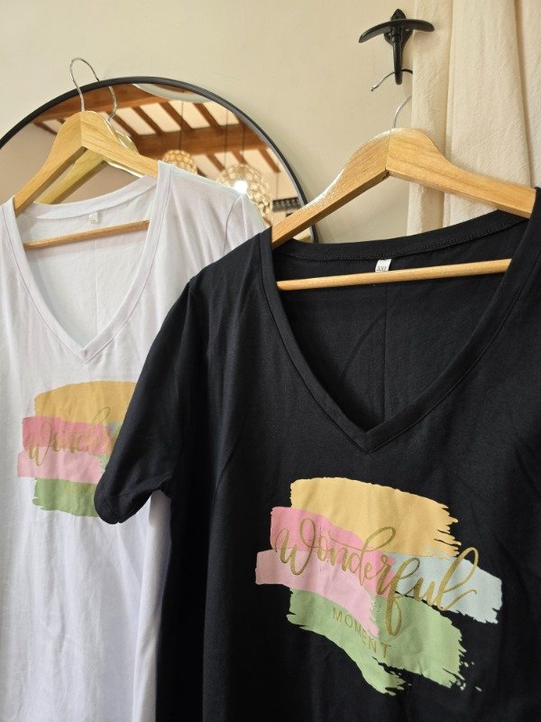Remera de algodón con estampa foil, cuello en v, talle unico, abarca hasta un talle XXL aproximadamente.