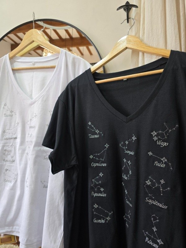 Remera de algodón con estampa y detalle de bordado lurex, cuello en v, disponible en talle XXL.
