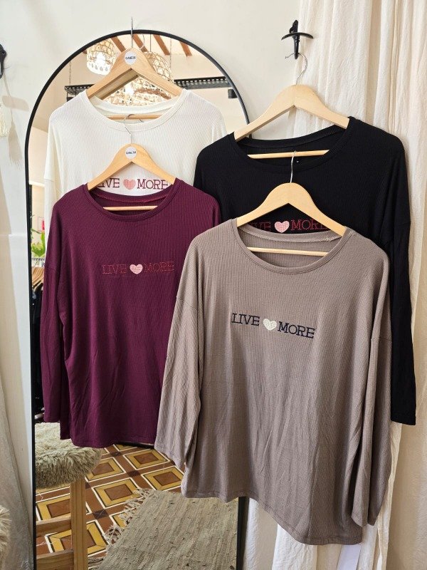 Remera "Live More". Abarca hasta talle 2XL aproximadamente. Disponible en varios colores.