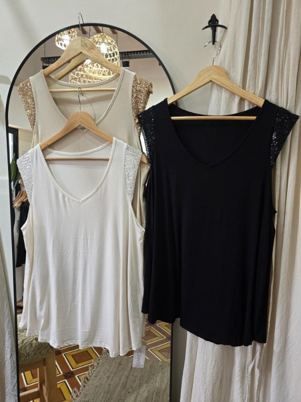 Musculosa de modal evase con detalle de lentejuelas en los hombros. Talle unico, abarca hasya un talle 6 aproximadamente.