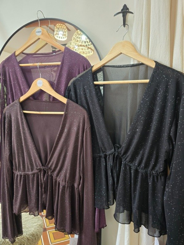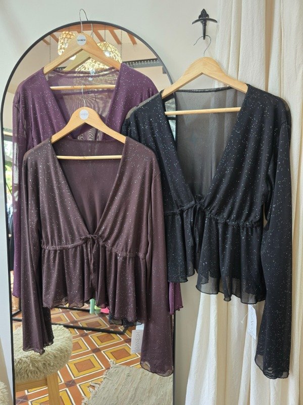 Top de tul brilloso, con cordón para atar y mangas oxford. Talle unico, abarca hasta un 115 de busto aprox.