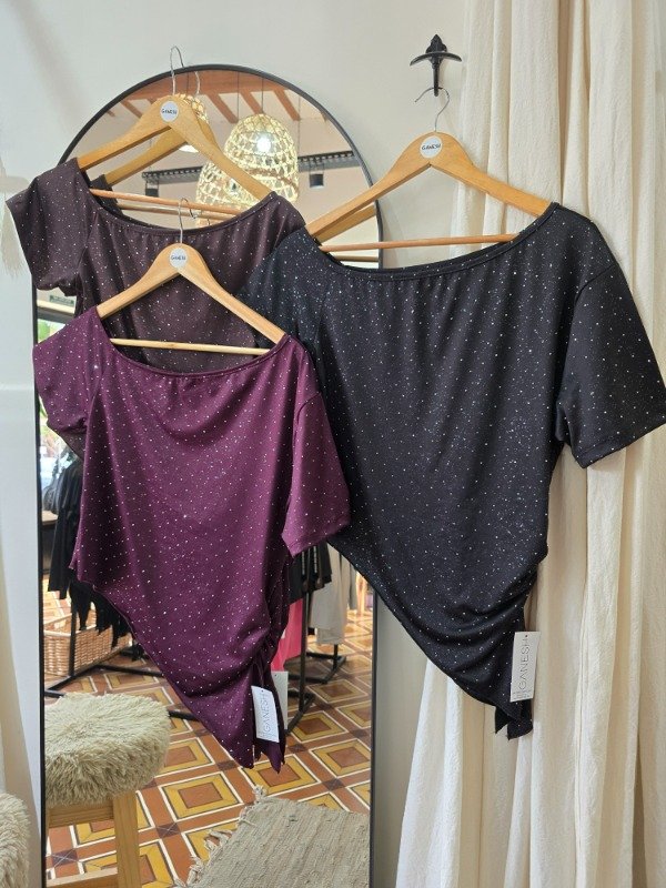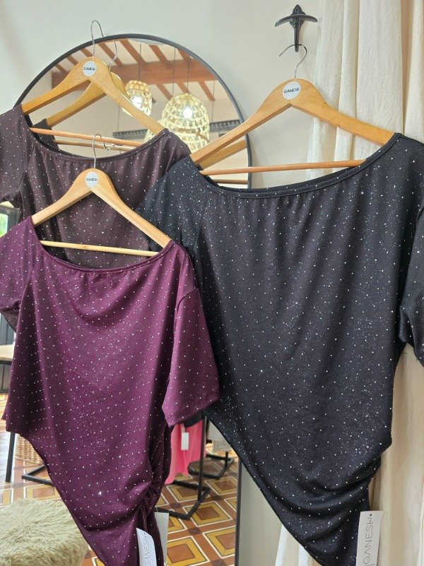 Top de lycra brilloso irregular, talle unico, abarca hasta un 115 de busto aprox.