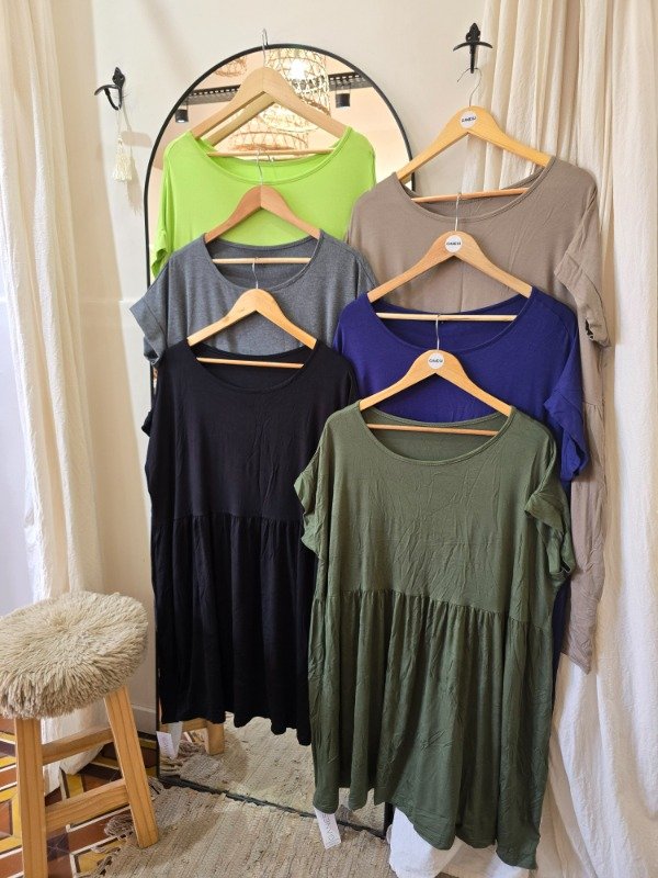 Vestido crep de verano, cuello redondo y recorte. Talle unico abarca hasta un talle 8 aproximadamente.