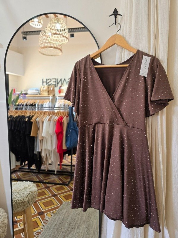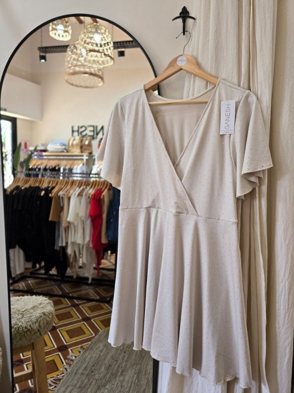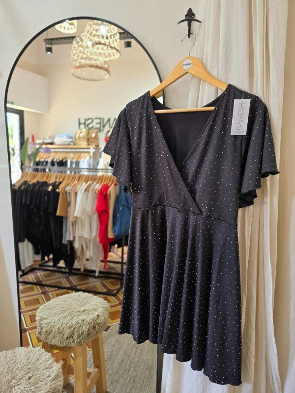 Vestido de lycra con stras, mangas cortas y corte en la cintura bien suelto.